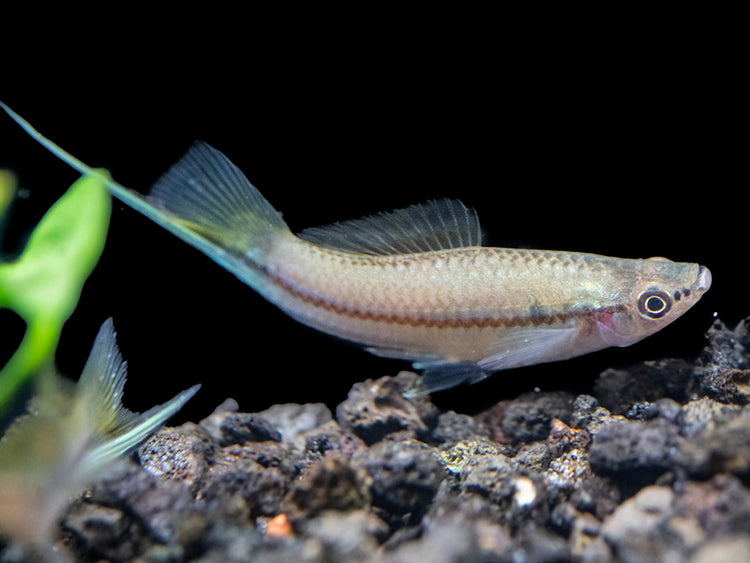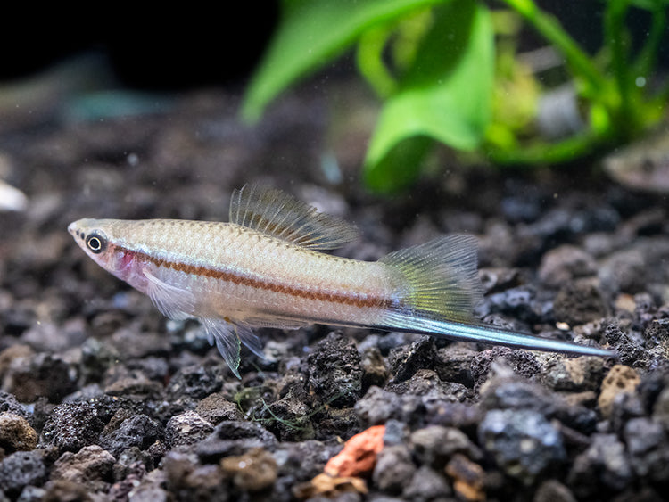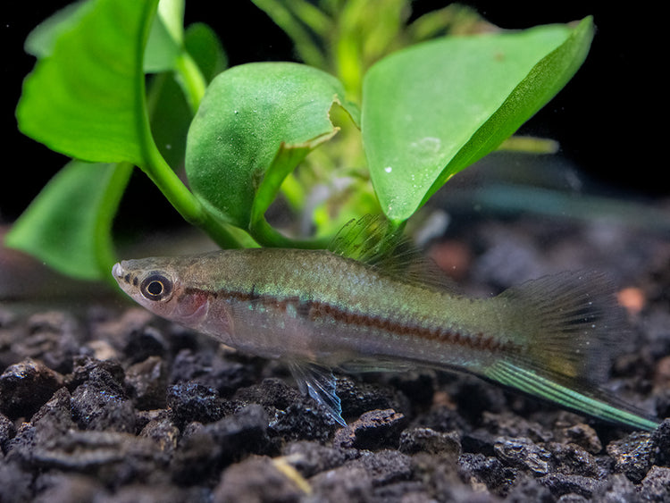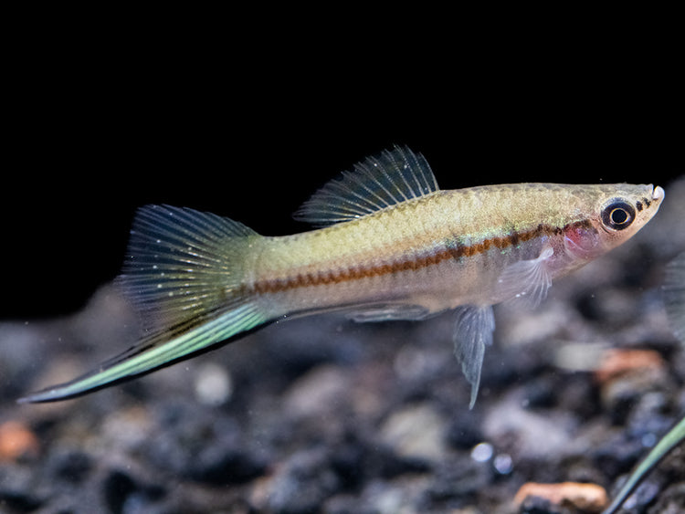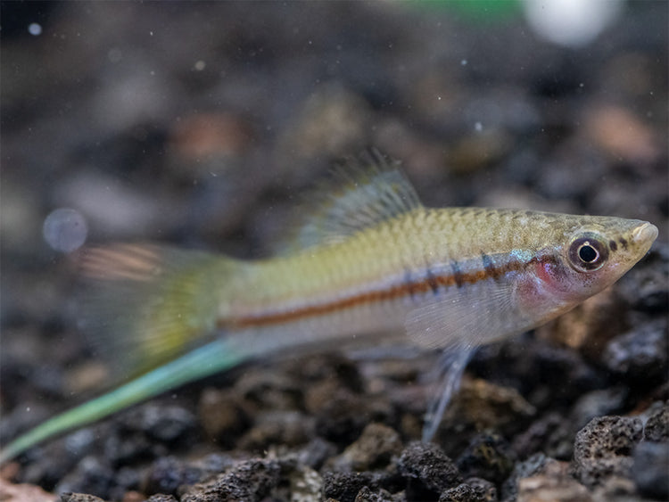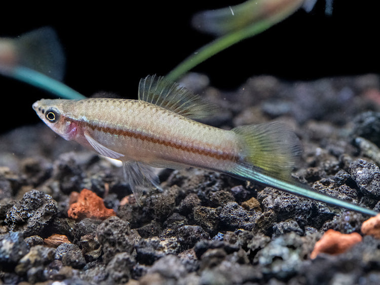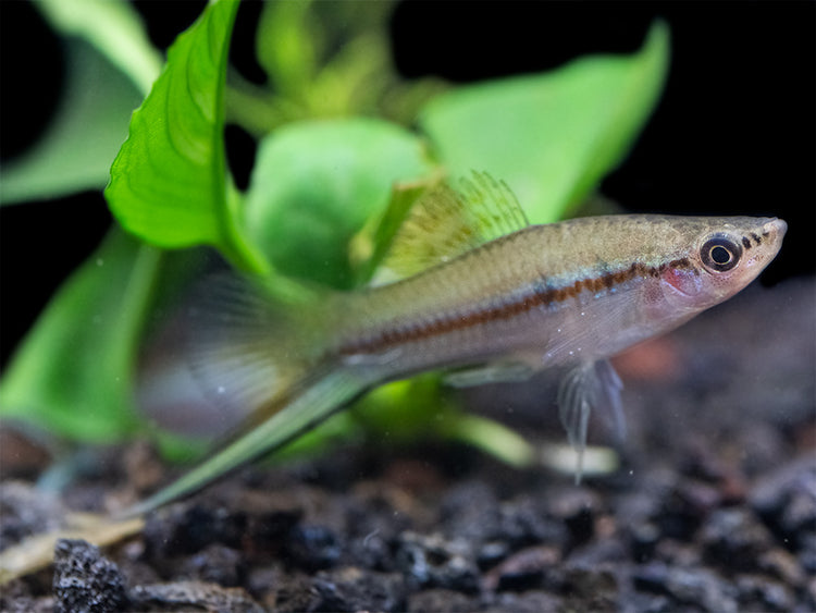 The Green Swordtail (Xiphophorus helleri) is the "wild form" color variety of this classic livebearer that has been consistently popular in the aquarium hobby for many decades. It has a variety of green, maroon, and yellow coloration. As is typical with swordtails, males have a long "sword" extension at the bottom of the tail, which is often a striking blue in this variety.