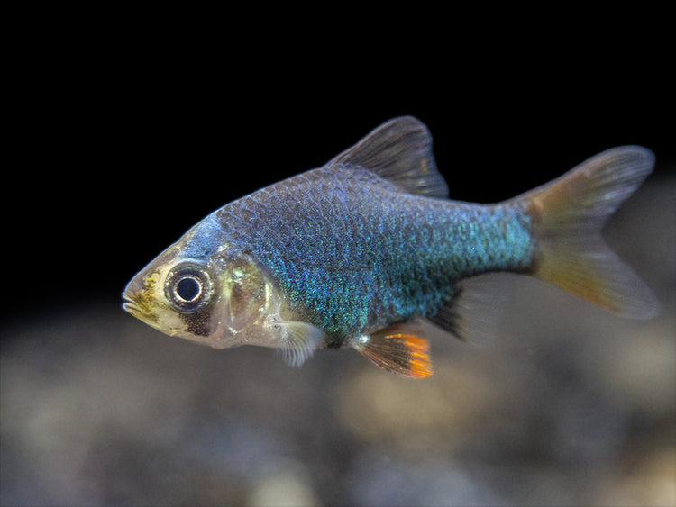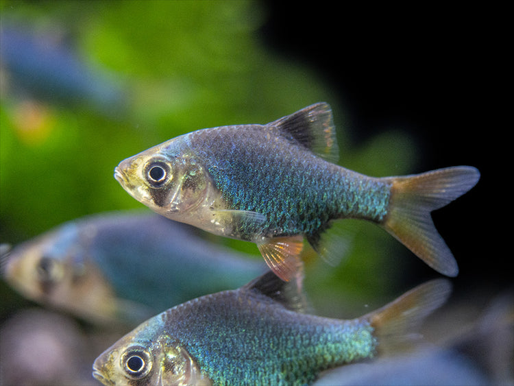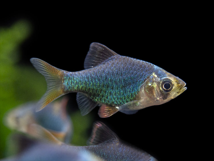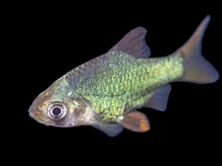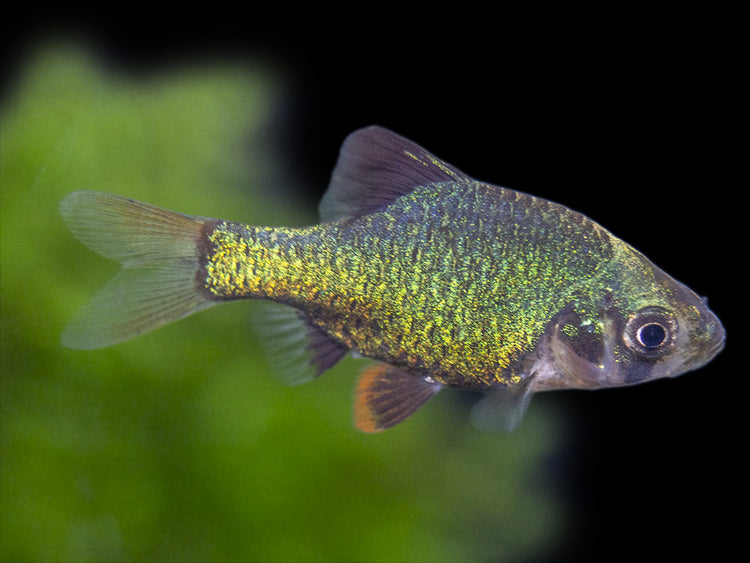 The Green Tiger Barb (Puntigrus tetrazona) is a semi-aggressive schooling species that is an excellent fish for the nano or planted aquarium. It is a notorious "fin-nipper", so it is best kept with quicker moving fish. It is known for its emerald green body and active behavior. It is rather exceptional in appearance, but not as common as the typical Tiger Barb. This particular species is native to Southern Sumatra, but is readily bred in the captivity. When kept in larger groups, males will display their best coloration while competing to attract females.