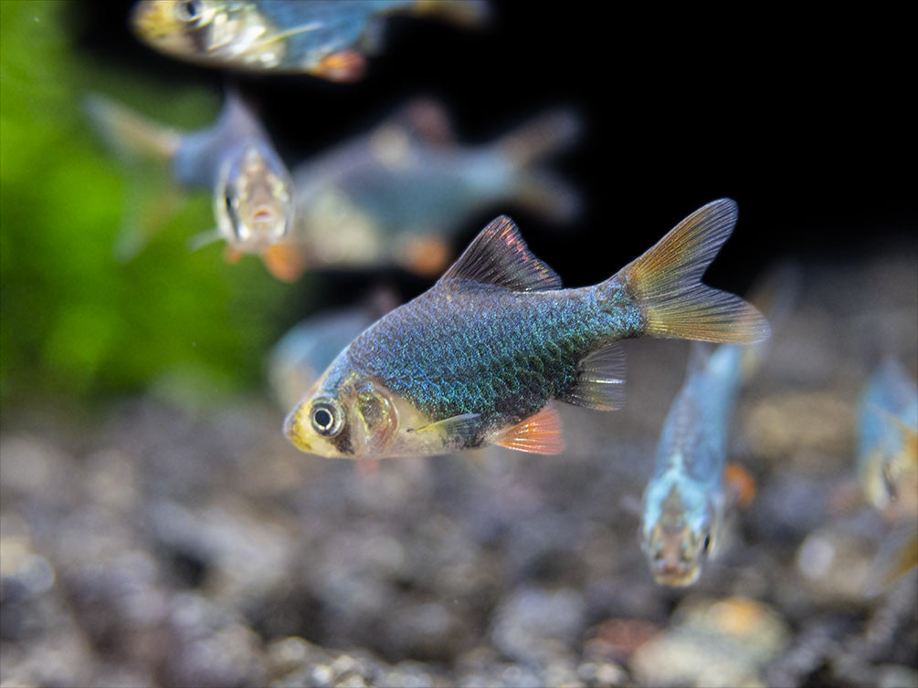 The Green Tiger Barb typically occupies the top and middle level of the water column, although it can often be seen swimming and feeding in the middle and bottom levels as well. It is safe with other fast moving fish such as danios, minnows, and tetras. Larger, slower moving fish with long fins such as Angelfish may be harassed. It may prey on smaller dwarf shrimp and their fry. Larger, peaceful invertebrates can make good tankmates. The Green Tiger Barb is best kept in groups of 6 or more, although larger groups are more ideal so that subdominant specimens are not bullied by dominant individuals during breeding behavior. It requires clean water to thrive and it will display optimal coloration and health in a planted aquarium with dark substrate. Low-light plants such as Java Fern, Anubias species, and Bucephalandra (Buce) species are excellent plants for its aquarium.