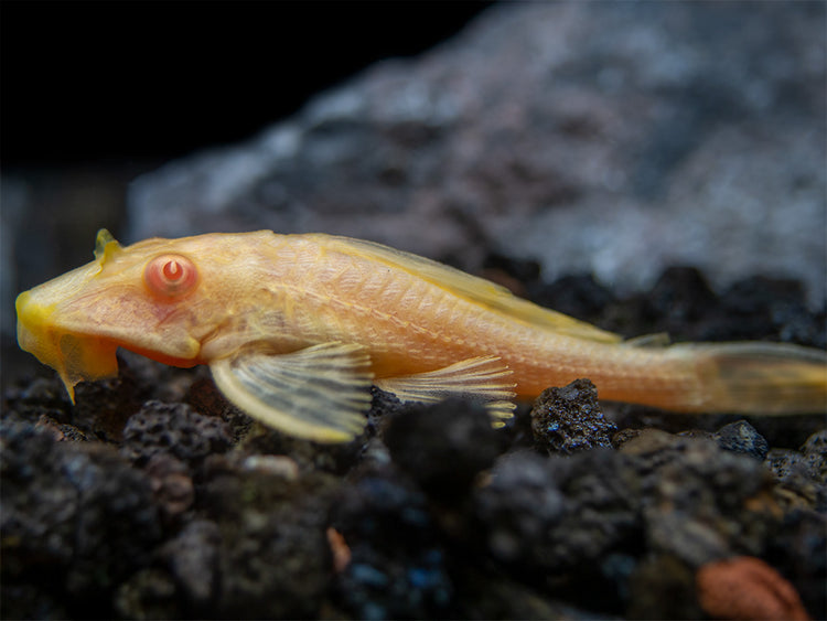 The Albino Sailfin Pleco is an excellent and resilient aquarium fish, but its eventual adult size necessitates a large aquarium. It is primarily nocturnal, but will often become active during daytime hours once established in an aquarium with plenty of driftwood, rockwork, and other hiding places. It typically will not bother plants intentionally, but larger specimens may inadvertantly uproot plants as they move around the bottom of the aquarium. Durable plants such as Java Fern and Anubias are good choices for the aquascape of this species. Male plecos may be somewhat territorial with other males of their own or similar species, but disputes can usually be diffused by providing ample territory and hiding places for each fish. All other tankmates will be generally ignored, although it is possible that small shrimp might fall prey to the Albino Sailfin Pleco. This fish produces substantial waste, so regular water changes and powerful filtration are an absolute necessity for its aquarium. The Albino Sailfin Pleco is compatible in many aquarium setups and is often an effective algae eater, but it must be kept in an aquarium of appropriate size and must never be released into US waterways. Aquarists who keep this species must plan accordingly regarding the housing of this long-lived fish.