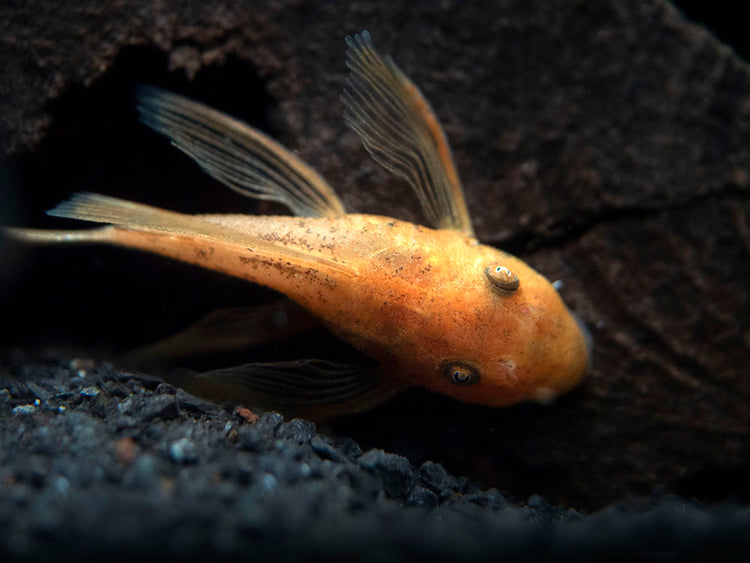 The Longfin Super Red Bristlenose Pleco (Ancistrus sp. “Super Red”), also known as the Bushynose or Bushymouth Pleco, is a member of the Loricariidae family of South American suckermouth catfishes. While many suckermouth catfish species have yet to be bred on any major scale in aquariums, the Longfin Super Red Bristlenose Pleco is being propagated by a few commercial breeders. Its facial area becomes adorned with many bristle-like appendages beginning in sub-adulthood. Both sexes grow the appendages, but the growth and length is much more pronounced in males. This "super red" variant has a yellowish appearance as a juvenile, but both males and females develop very deep red-orange coloration as they mature.