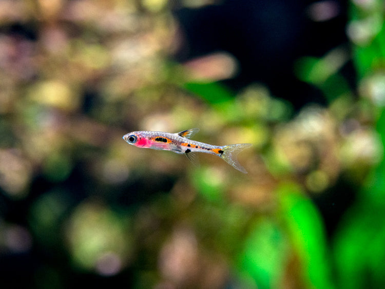 The Phoenix Rasbora (Boraras merah) is a strikingly beautiful nano fish that is very popular among aquarists due to its schooling behavior, peaceful disposition, and very small size. This schooling fish can be the highlight in any peaceful community aquarium and it is a particular standout in the planted aquarium. With optimal diet and care, many males of this species display bright ruby red coloration. This species is often confused with the very similar Chili Rasbora (Boraras brigittae). In fact, there is some debate among experts as to whether the Phoenix Rasbora and the Chili Rasbora are in fact separate species or rather just geographic variants of a single species. Compared to the markings and color of the Chili Rasbora, the Phoenix Rasbora’s dark markings are typically more broken and red coloration is more limited to these areas of dark markings.