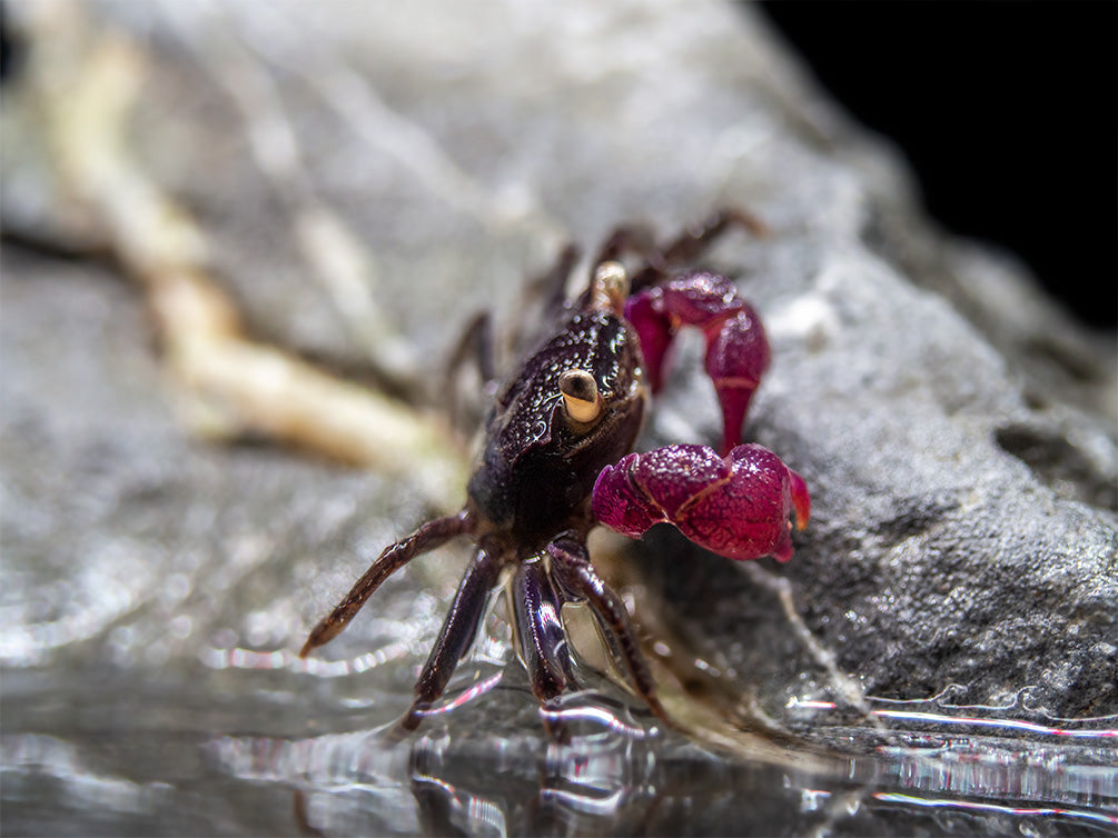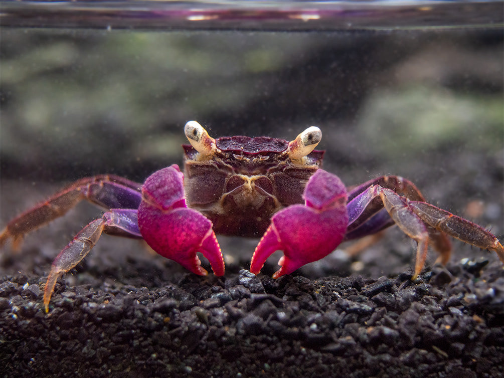 The Purple Vampire Crab (Geosesarma bogorensis) is a small, very colorful, semi-terrestrial species that is native to Java, Indonesia. It inhabits forest areas near streams, rivers, and ponds. It spends most of its time on land, but also often submerges in freshwater, including when it molts. It is communal with its own species, and males typically are larger than females, and also have much larger claws.