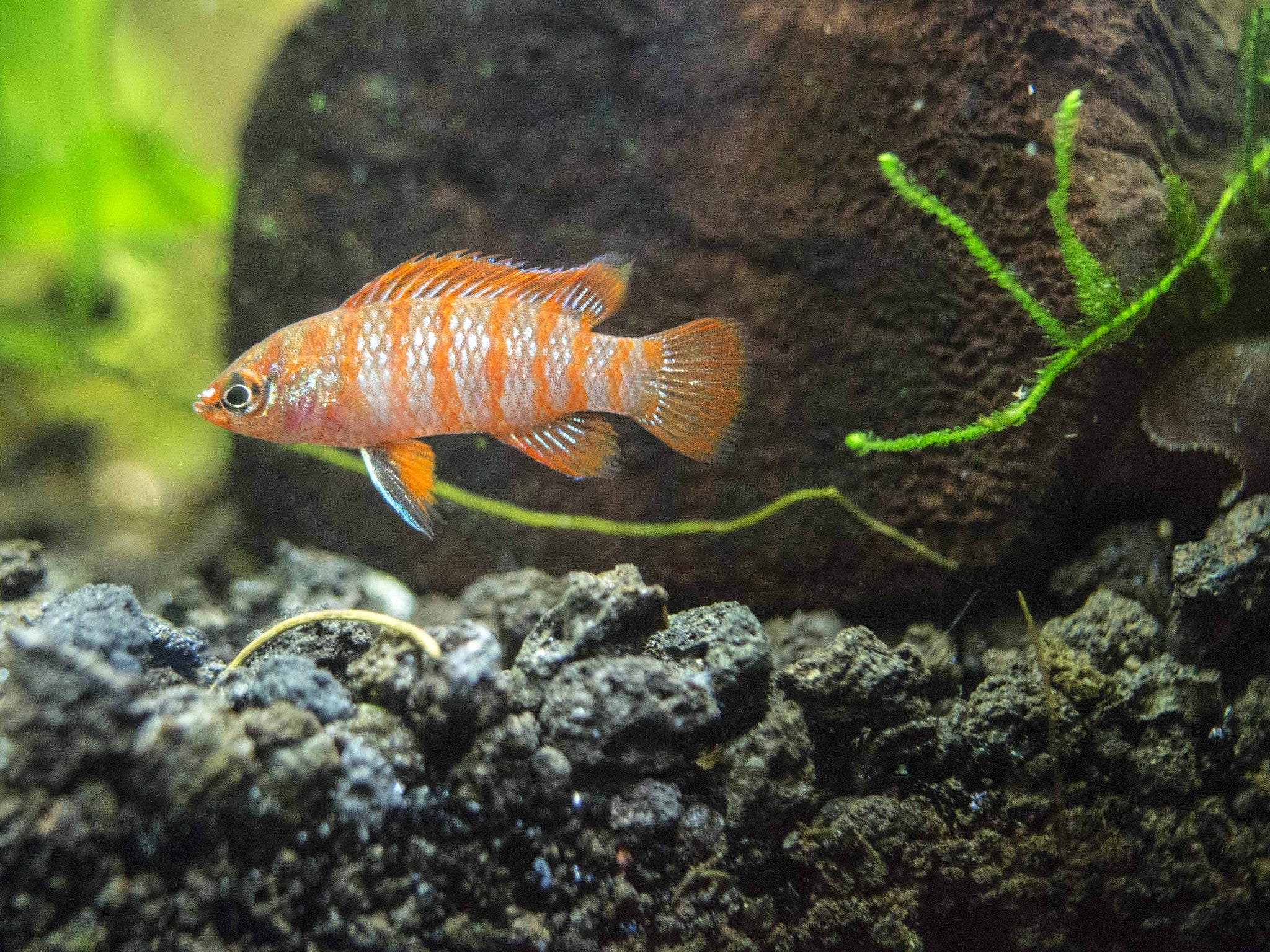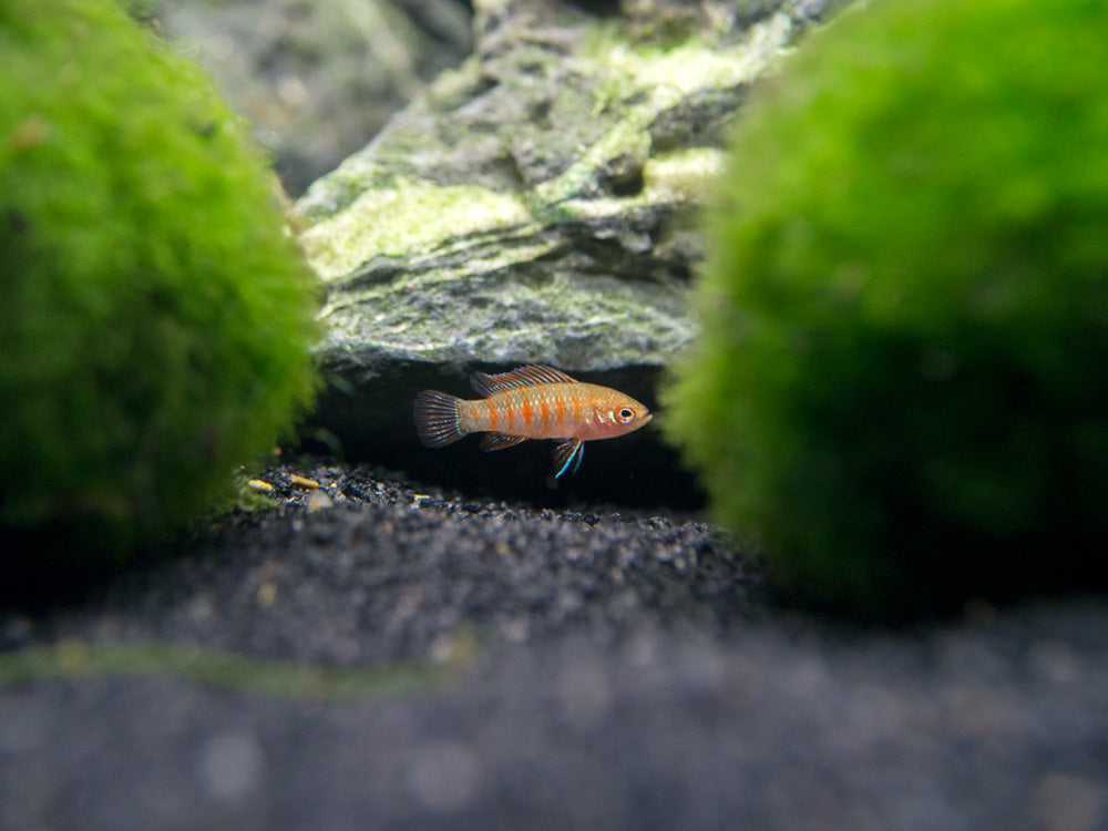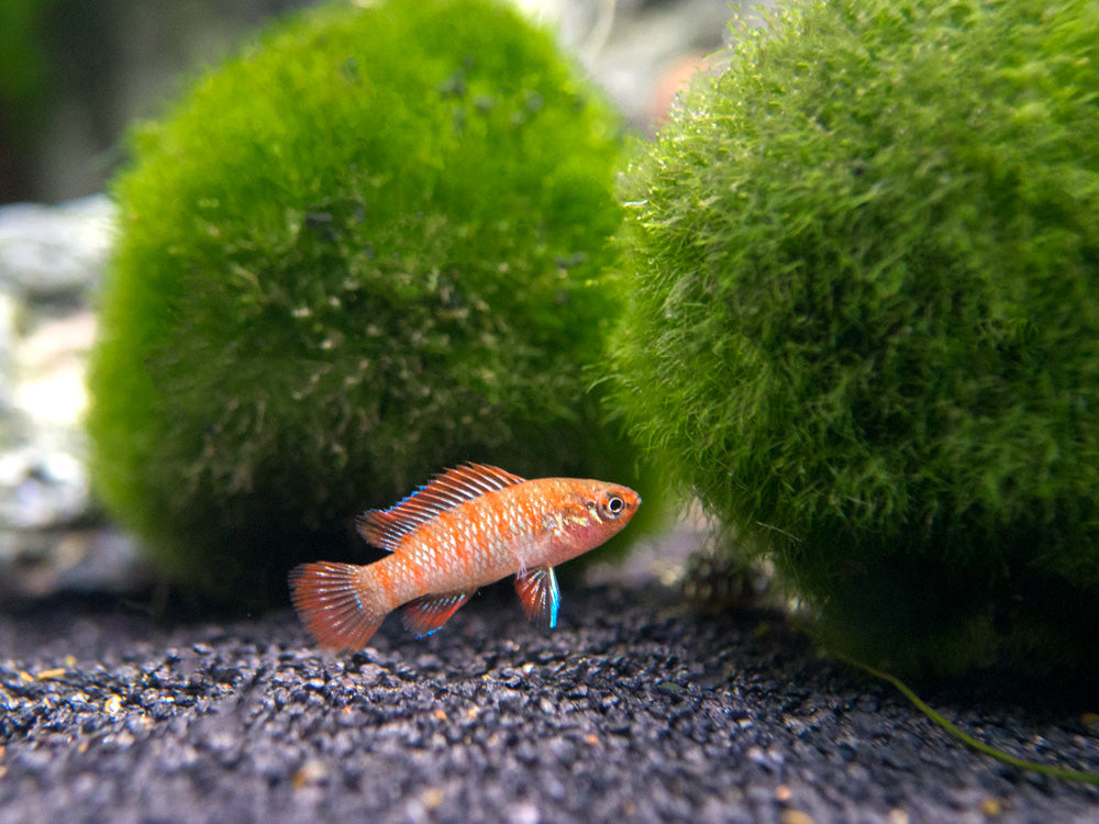 The aquarium of the Scarlet Badis should include plenty of plants, rockwork, and driftwood. Plenty of cover is necessary for this species and will ensure the most activity and least stress. This fish is a cave spawner, so it is also a good idea to shape some décor into cave-like structures. During spawning, the male will guard the eggs and newly-hatched fry, but any adults should be removed thereafter to avoid cannibalism of the fry by the parents.