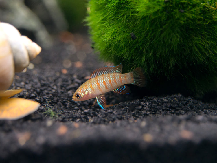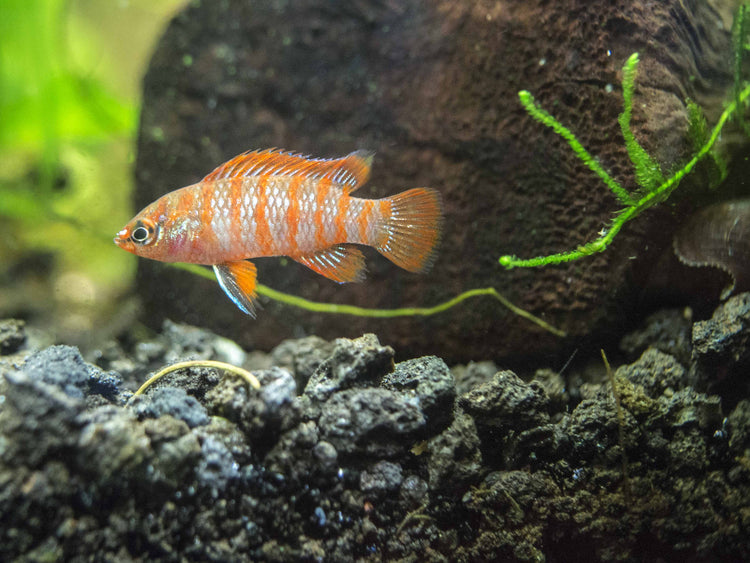 The Scarlet Badis will thrive in a planted aquarium with relatively mild to moderate water flow and is generally peaceful with other species of fish. Though it is a micropredator, its small size makes it safe with virtually any fish or invertebrate that is too large to be considered prey. It can be housed with some invertebrates such as snails and larger shrimp, but it may eat the fry and juveniles of most Caridina and Neocaridina shrimp or any other small invertebrates that will fit in its mouth. The Scarlet Badis is somewhat timid compared to more boisterous fish, so it is necessary to make sure that this badis is not outcompeted for food. It may hybridize with other similar badis species.