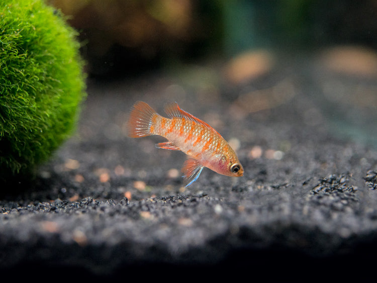 The Scarlet Badis (Dario dario), also known as the Gem Badis AKA Rainbow Badis, is a beautiful micro fish that hails from India. This rare fish displays brilliant red and blue vertical striping across its entire body. It is a somewhat timid fish, but it will become more bold and active in a heavily planted, well decorated aquarium where it will feel secure. Males are the most colorful when competing for the attention of females, which are less colorful but still often have noticeable blue and red coloration.