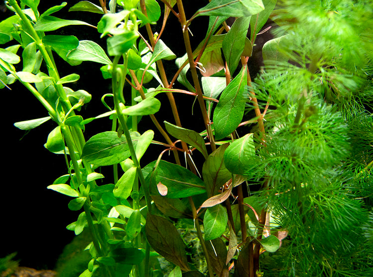 A variety of aquatic stem plants that do not require special equipment, care, or knowledge. Includes moneywort, dark red ludwigia, and green cabomba.