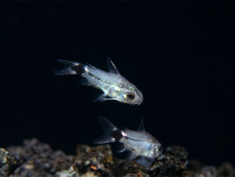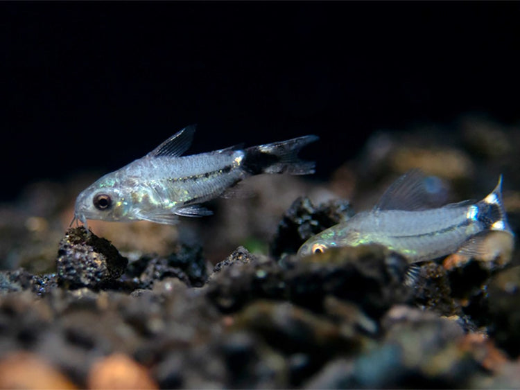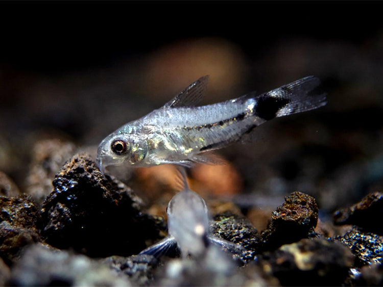 Tail Spot Pygmy Corys are schooling fish that thrive in groups, creating a lively and interactive display. They are known for their unique swimming behavior, often seen darting around the tank and occasionally swimming mid-water, unlike other bottom-dwelling corydoras.