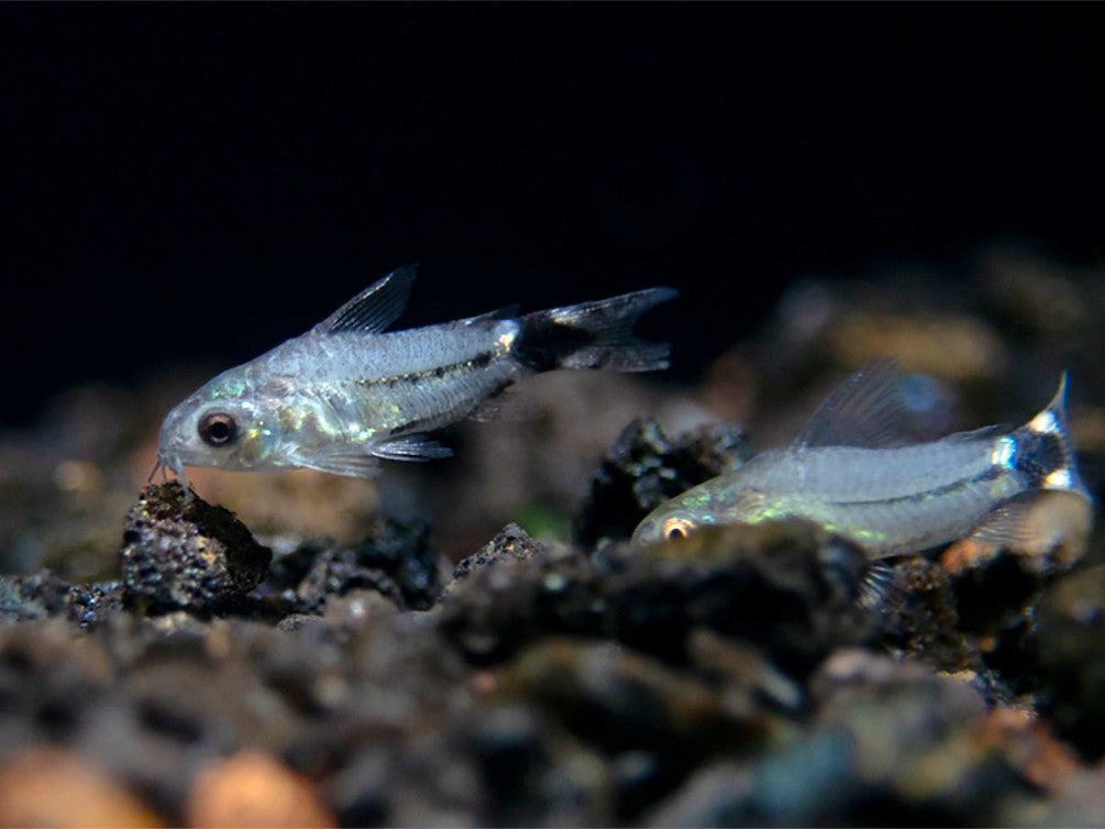 Tail Spot Pygmy Corys are omnivorous and will thrive on a varied diet. High-quality micro pellets, crushed flakes, and occasional treats of frozen or live foods such as baby brine shrimp and microworms will keep them healthy and active. A varied diet ensures they receive all necessary nutrients for optimal health and coloration.