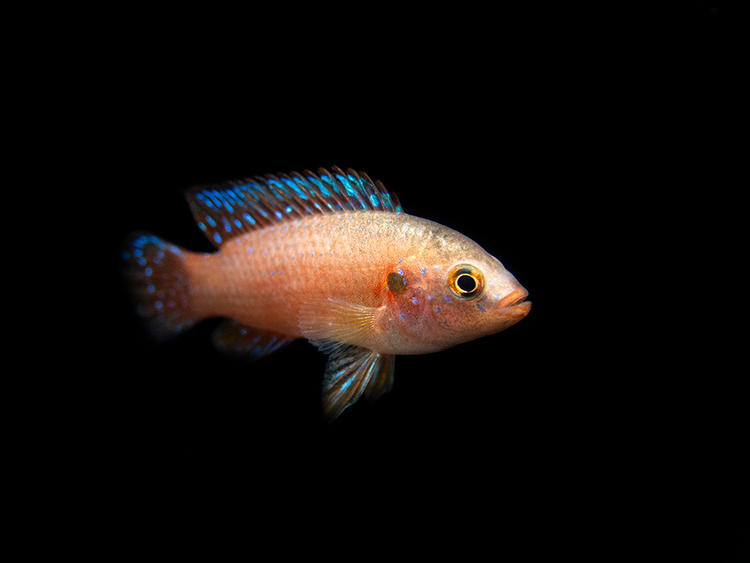 The Turkana Jewel Cichlid (Hemichromis exsul) is a relatively small cichlid species that matures to a brilliant peach to ruby overall coloration and, like its close relatives, has many neon blue and blue-green spots. Native to Kenya's Lake Turkana, this African species enjoys water conditions similar to New World (South and Central American) species. It is remarkably peaceful (outside of breeding time) for a cichlid of its size and can possibly even be kept in a sort of cichlid community setting in an aquarium of adequate space.